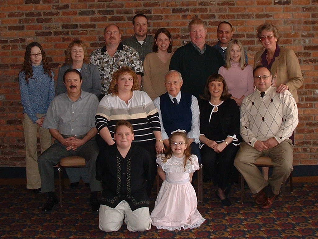 Left to right starting with the front row are Tyler and Riley the son and daughter of Debbie and Steve. In the second row are Dave (Leo's son), Debbie Leo's daughter), Leo (the one who started all this), Diane (Leo's daughter), and Gary (Leo's son) In the third row are Kerri (Dave and Sandy's daughter), Sandy (Dave's wife), Steve (Debbie's husband), Don (Diane and Dan's son), Wendy (daughter of Diane and Dan), Dan (Diane's husband), Paul (Diane and Dan's son), Kelly (daughter of Dave and Sandy), Nancy (Gary's wife)